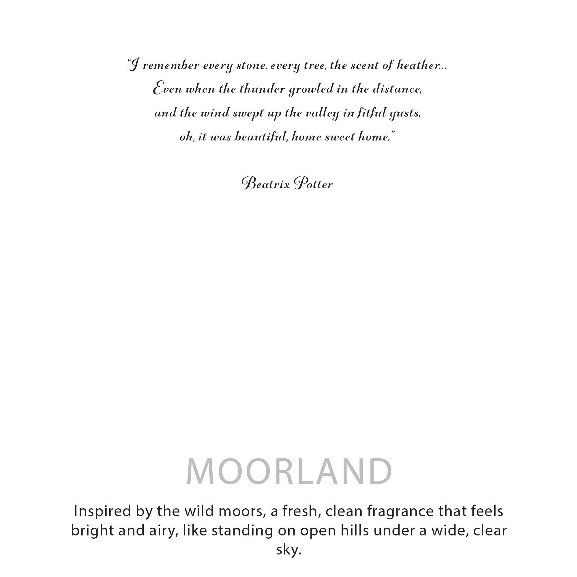 Inspirado por los extensos y abiertos páramos del Distrito de los Lagos, Moorland es una fragancia fresca y limpia que se siente ligera y expansiva. Captura la sensación de estar de pie en colinas abiertas bajo un cielo despejado, con aire fresco y espacio por todas partes a tu alrededor.